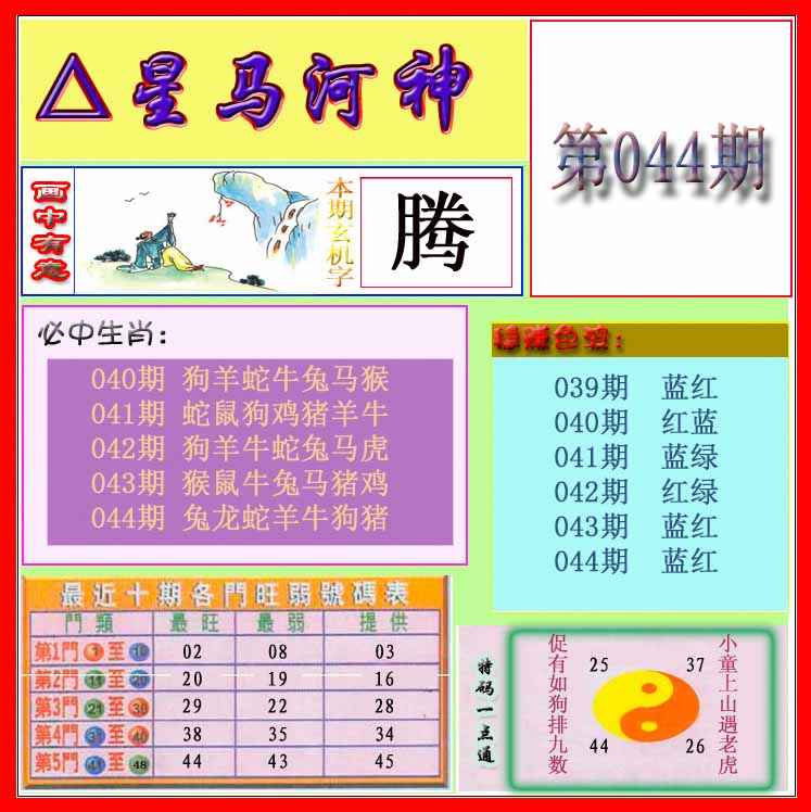 041期:【跑狗九肖】开狗20 跑狗九肖:羊龙狗牛猪兔虎马鼠 跑狗七肖:羊龙狗牛猪兔虎 跑狗五肖:羊龙狗牛猪 跑狗三肖:羊龙狗 12码:14 15 01 43 22 17 32 02 25 45 33 31 | ||