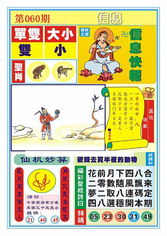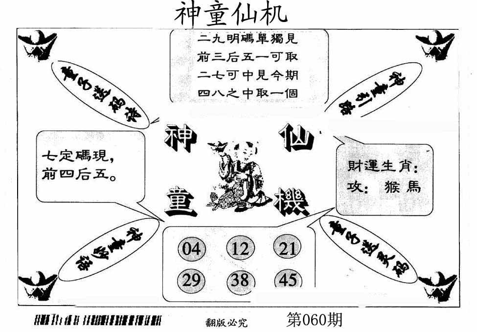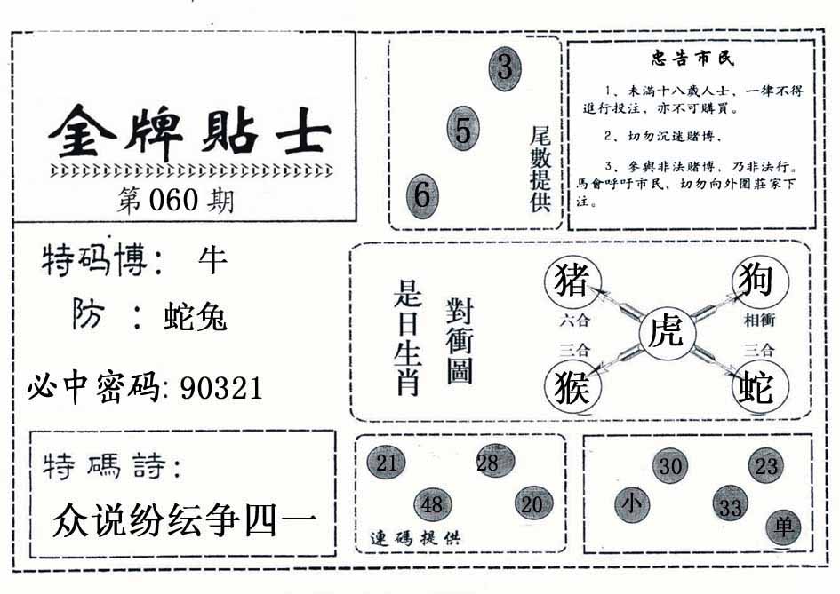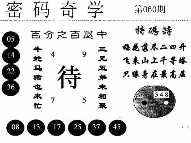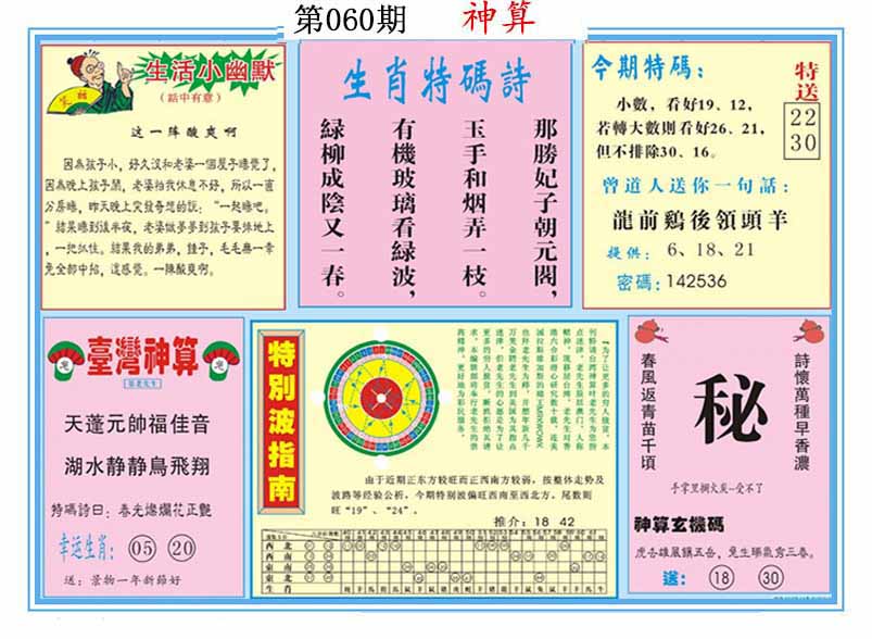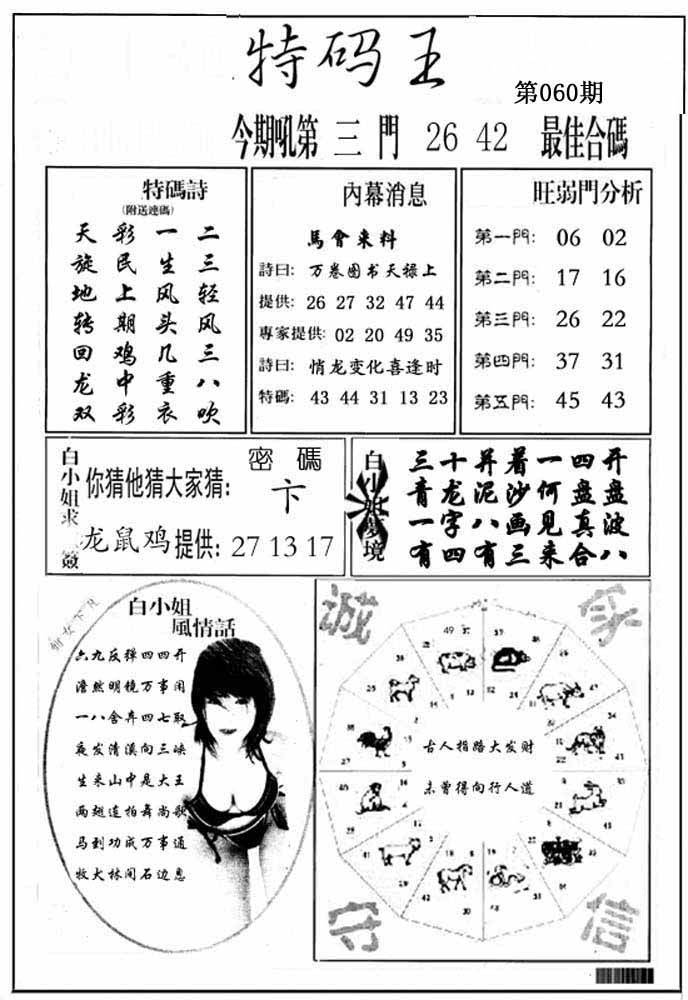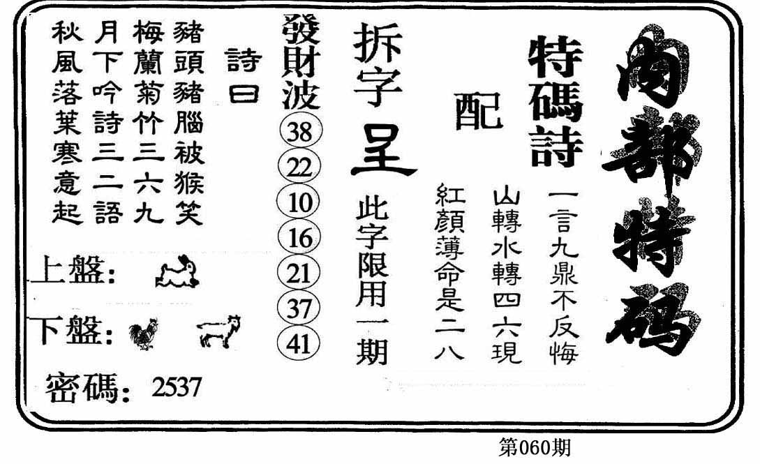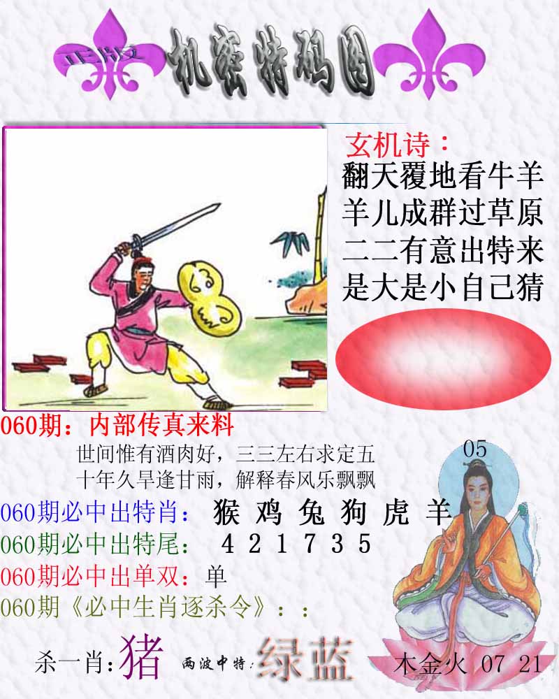 | 060期:《主攻:内幕规律平特肖:<鸡>下50万》! | ||
