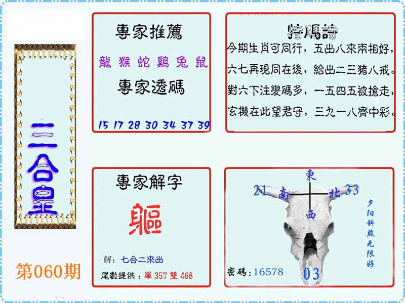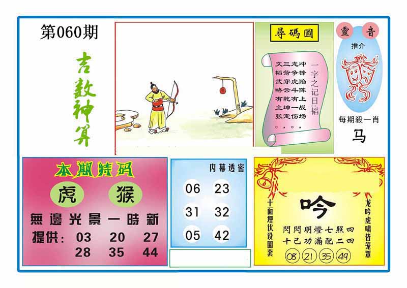| 060期:神奇七尾【1 2 5 3 8 4 7】开:?00 |