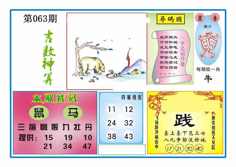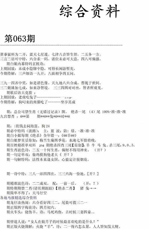 063期:【跑狗九肖】开0 跑狗九肖:蛇鼠牛马猴狗羊猪龙 跑狗七肖:蛇鼠牛马猴狗羊 跑狗五肖:蛇鼠牛马猴 跑狗三肖:蛇鼠牛 12码:23 43 07 48 33 45 18 35 37 03 27 24 | ||