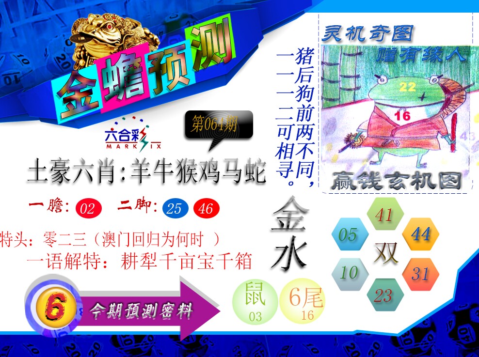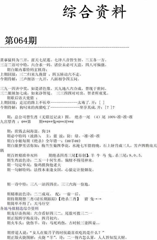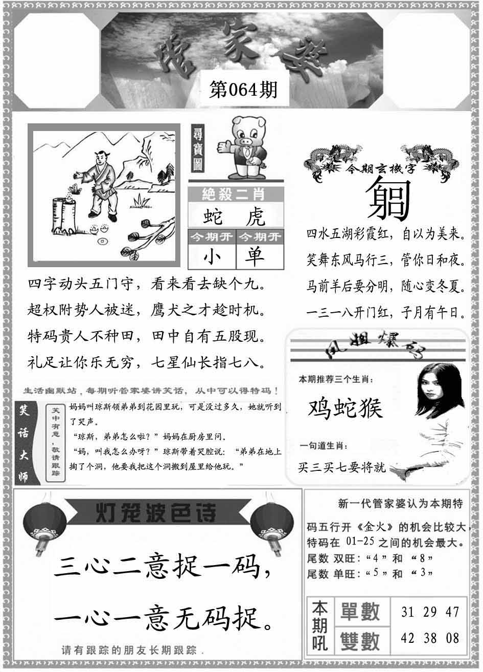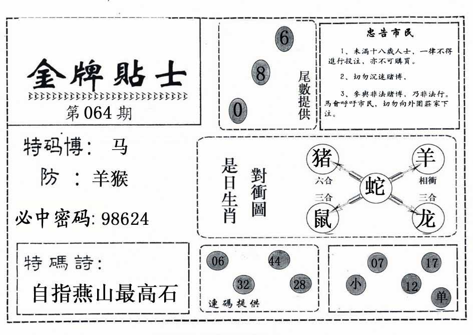 064期推荐六肖:<蛇羊猴虎兔狗>内幕资料请大胆下注! | ||
