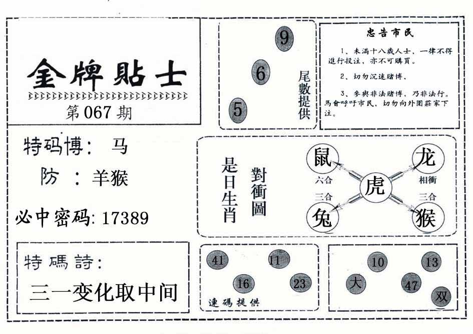 064期:【跑狗九肖】开鼠43 跑狗九肖:鸡龙羊兔牛猪蛇马虎 跑狗七肖:鸡龙羊兔牛猪蛇 跑狗五肖:鸡龙羊兔牛 跑狗三肖:鸡龙羊 12码:31 48 24 19 06 46 49 47 13 26 37 21 | ||