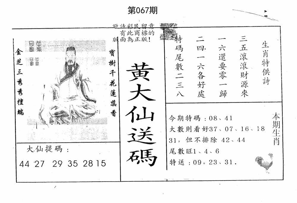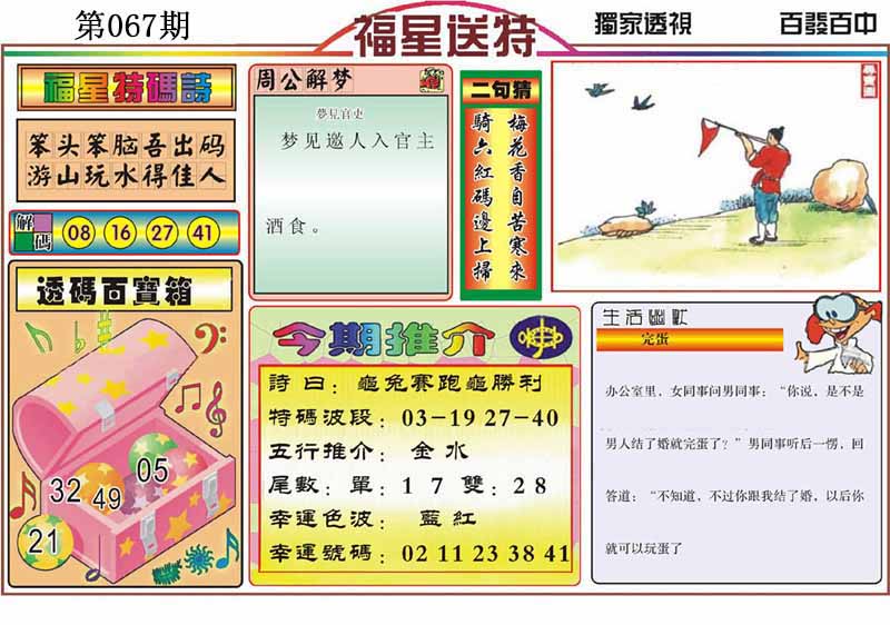 065期:【跑狗九肖】开龙03 跑狗九肖:狗猴羊龙蛇虎兔鼠鸡 跑狗七肖:狗猴羊龙蛇虎兔 跑狗五肖:狗猴羊龙蛇 跑狗三肖:狗猴羊 12码:05 16 41 09 22 21 27 08 32 29 12 43 | ||
