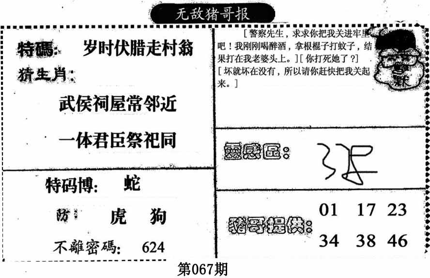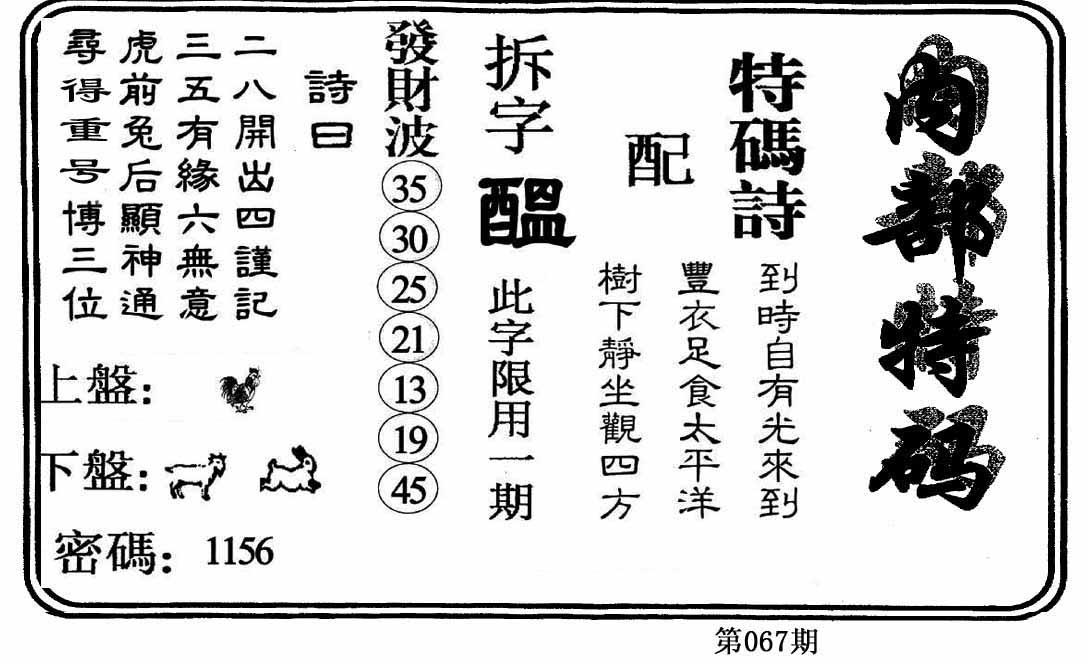 066期:【跑狗九肖】开0 跑狗九肖:兔牛猪马蛇羊鸡狗猴 跑狗七肖:兔牛猪马蛇羊鸡 跑狗五肖:兔牛猪马蛇 跑狗三肖:兔牛猪 12码:13 03 39 01 29 37 38 23 33 35 34 10 | ||