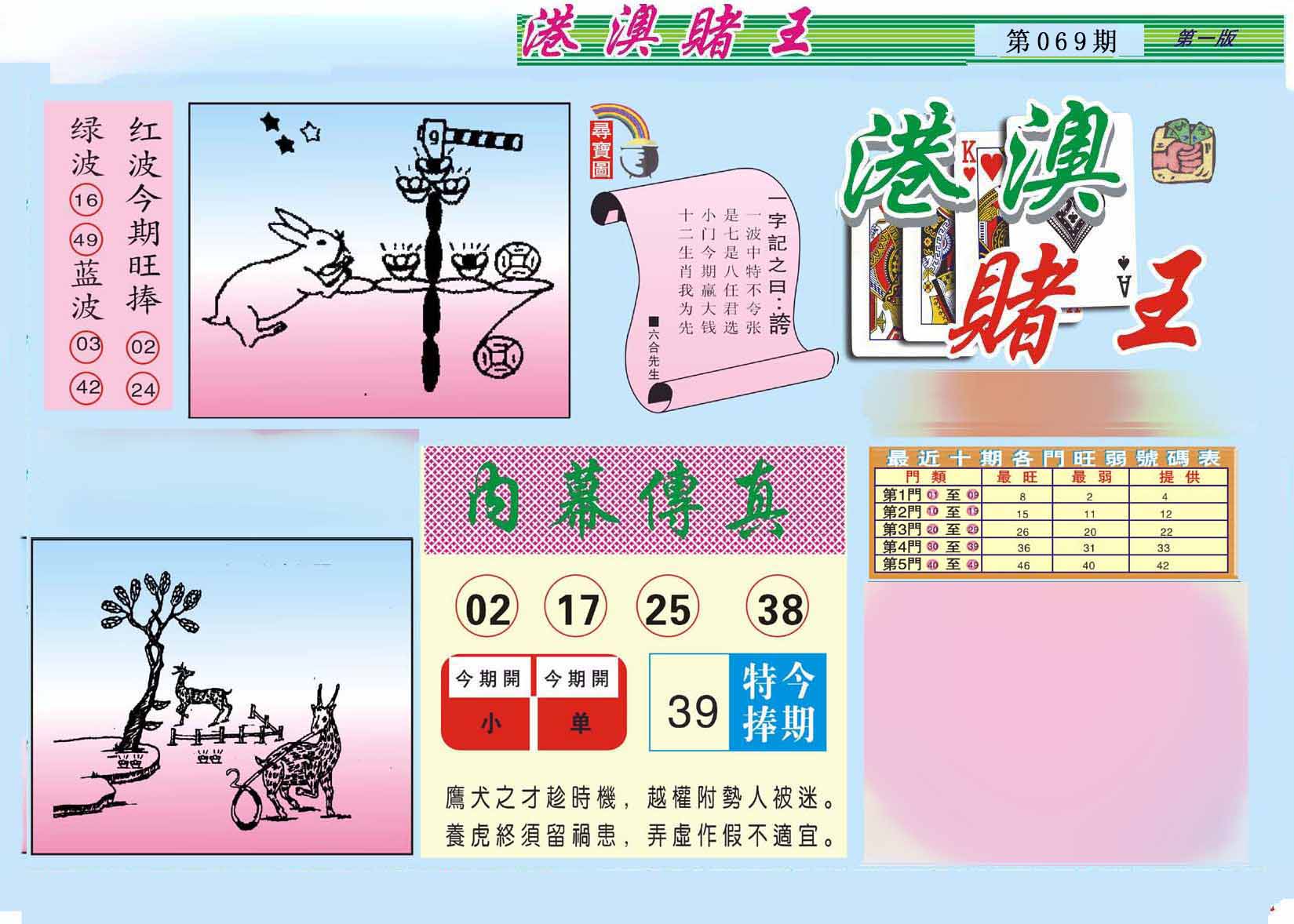 069期:【跑狗九肖】开0 跑狗九肖:狗猴兔虎马鸡蛇羊牛 跑狗七肖:狗猴兔虎马鸡蛇 跑狗五肖:狗猴兔虎马 跑狗三肖:狗猴兔 12码:25 06 48 11 27 49 12 15 18 03 46 23 | ||