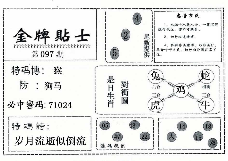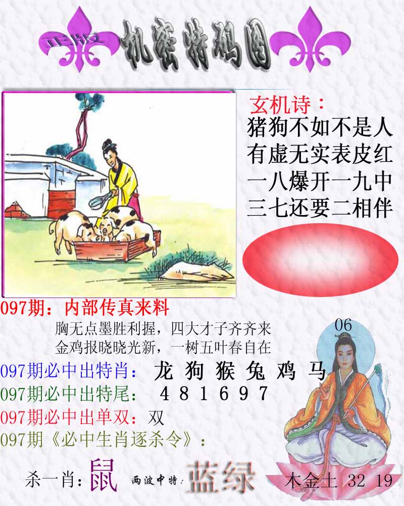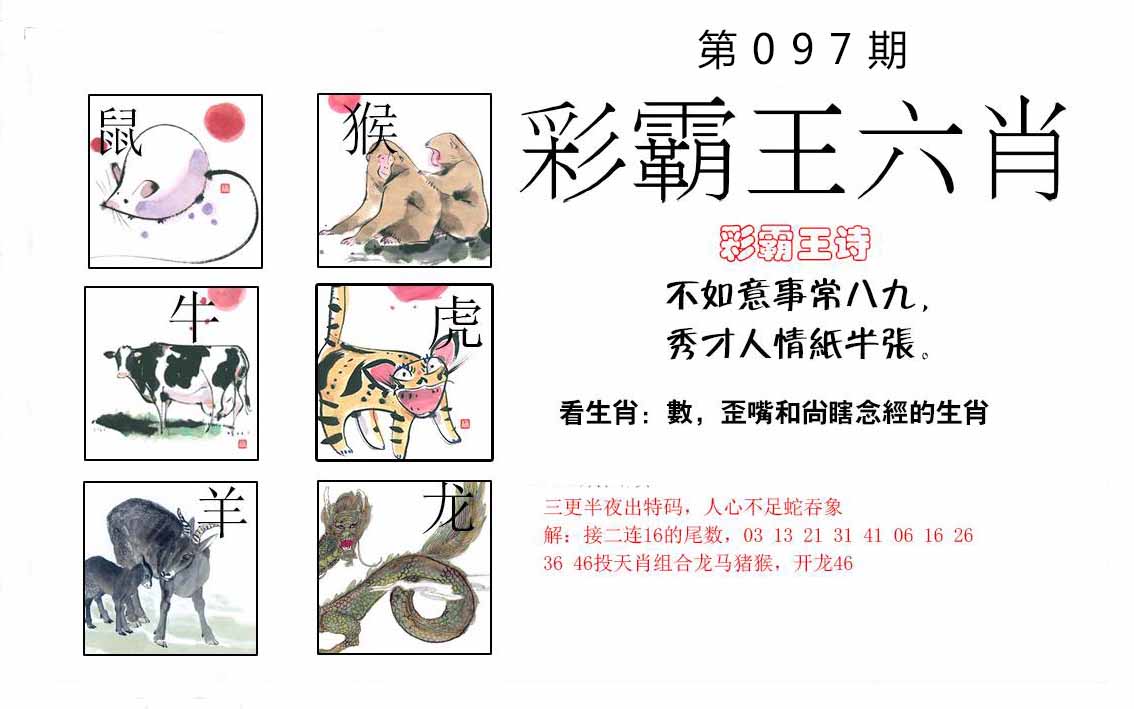 097期推荐六肖:<猪鸡虎狗兔马>内幕资料请大胆下注! | ||