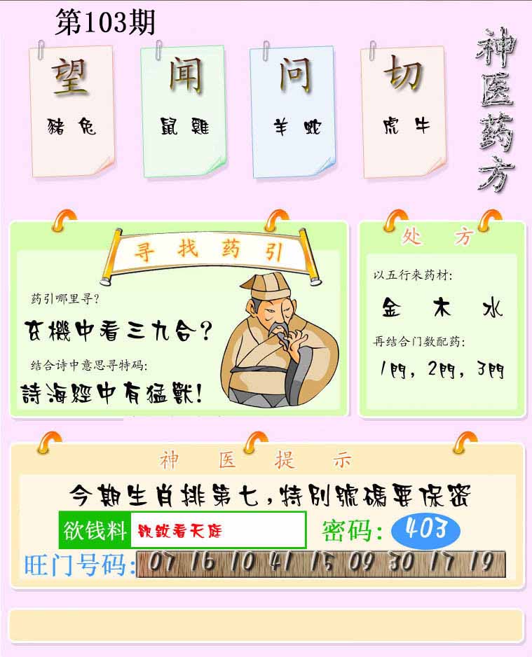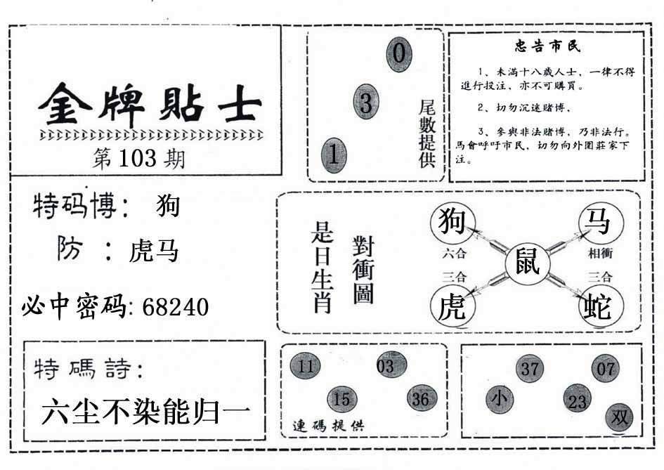 | 103期:神奇七尾【6 5 0 3 7 8 1】开:?00 |