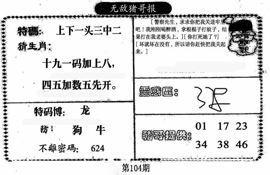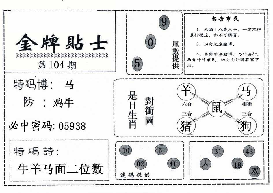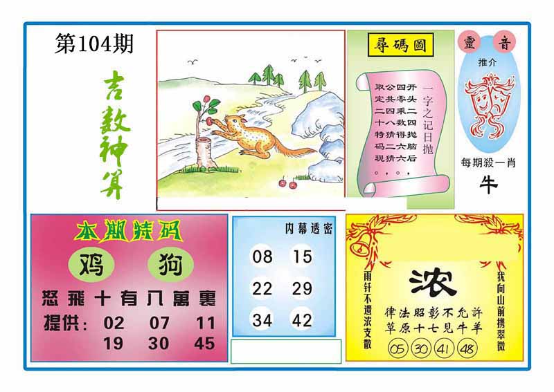 104期:【跑狗九肖】开牛42 跑狗九肖:虎猪牛狗鼠龙猴鸡兔 跑狗七肖:虎猪牛狗鼠龙猴 跑狗五肖:虎猪牛狗鼠 跑狗三肖:虎猪牛 12码:42 23 02 12 15 13 36 34 05 11 06 04 | ||