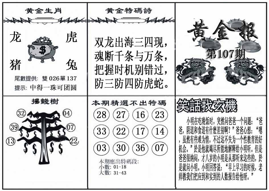 107期:【跑狗九肖】开0 跑狗九肖:猪鼠猴羊马蛇龙虎狗 跑狗七肖:猪鼠猴羊马蛇龙 跑狗五肖:猪鼠猴羊马 跑狗三肖:猪鼠猴 12码:29 05 21 10 45 02 38 35 26 34 41 12 | ||