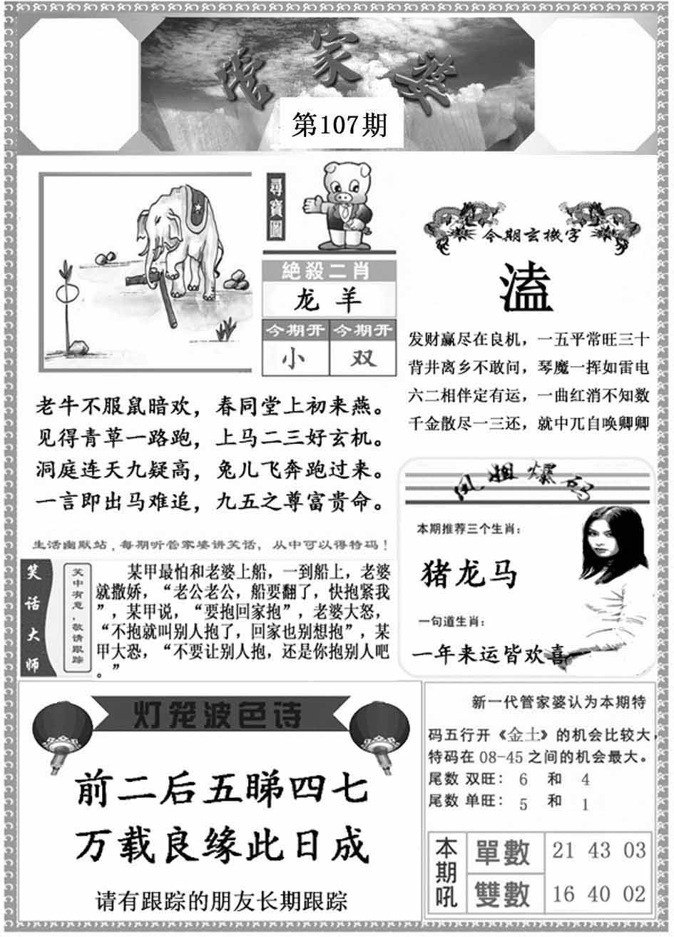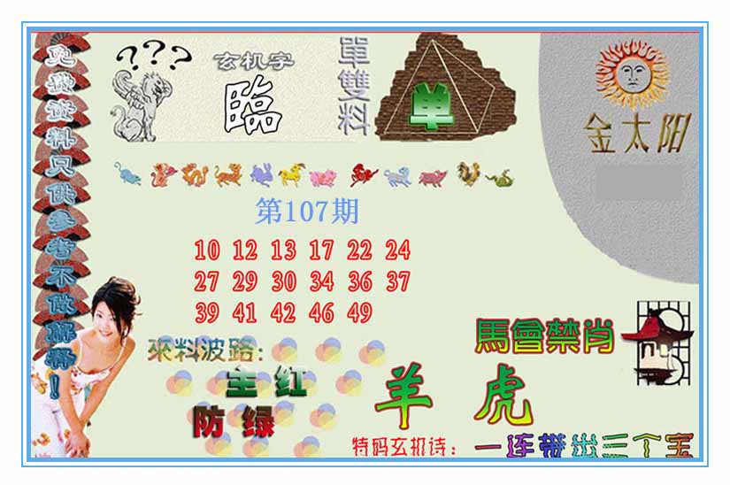 107期推荐六肖:<虎羊龙鼠蛇猪>内幕资料请大胆下注! | ||