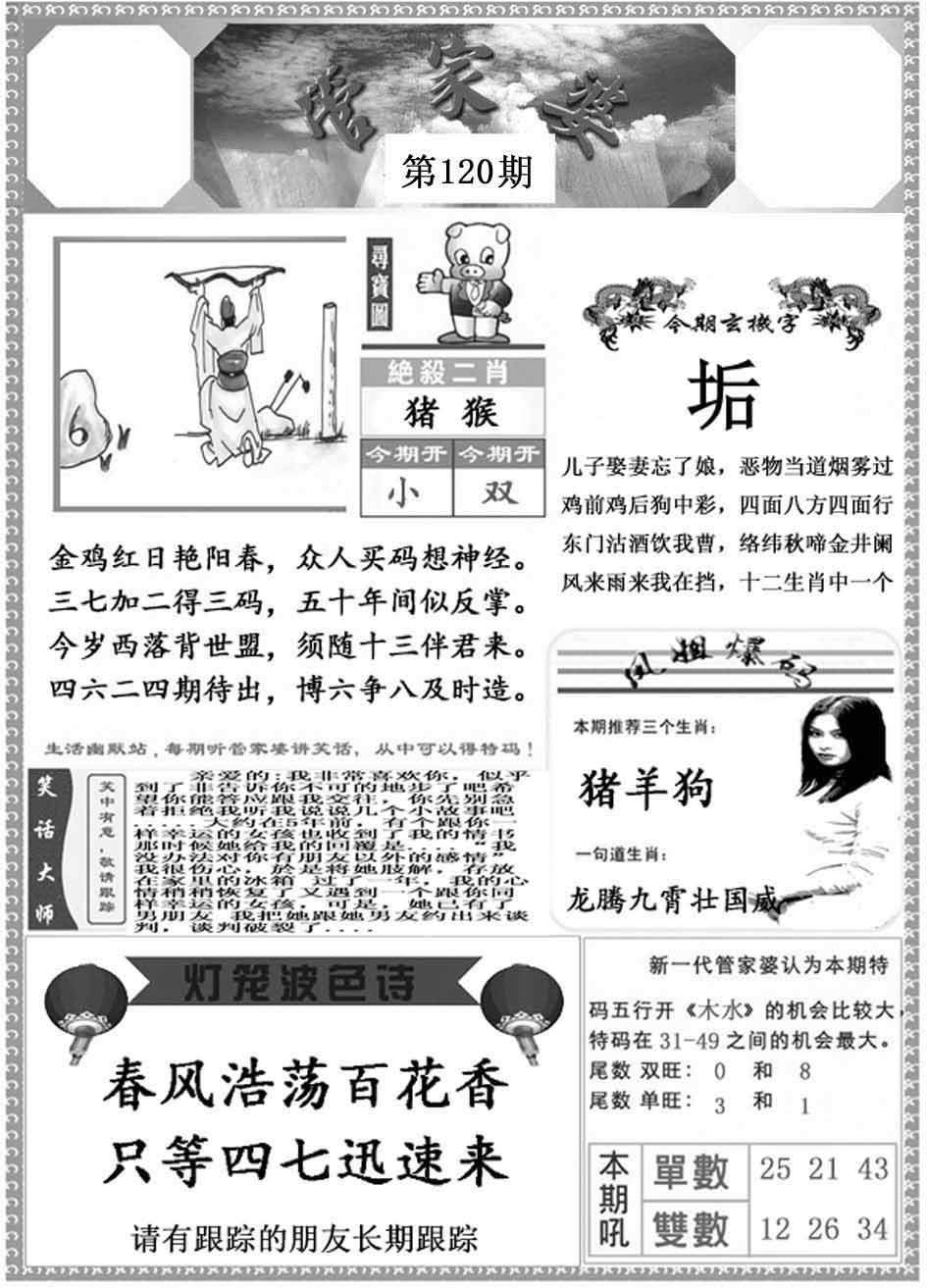 | 117期:神奇七尾【3 7 5 4 6 8 0】开:猪20 |