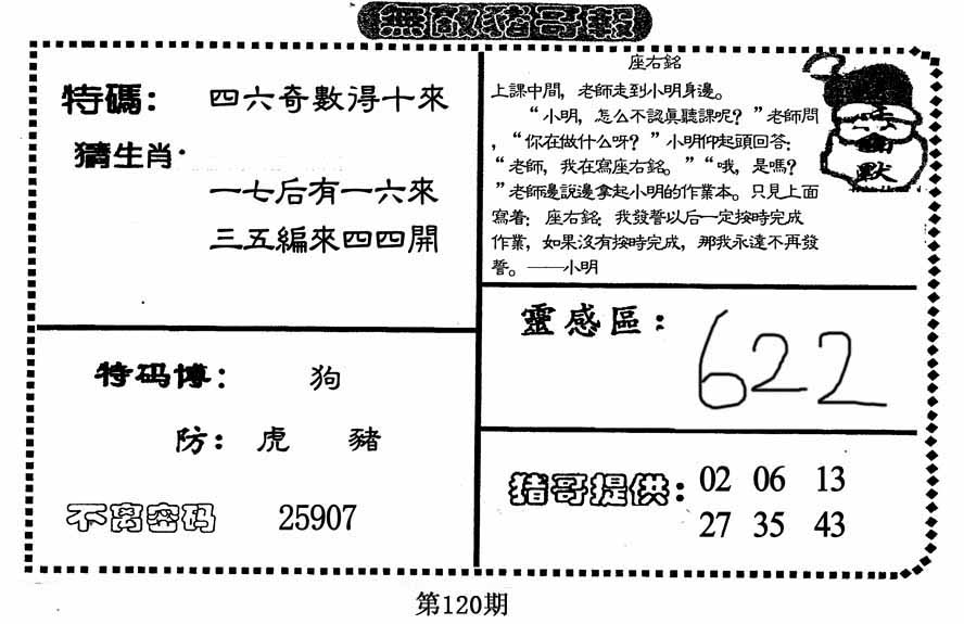 117期:【跑狗九肖】开猪20 跑狗九肖:兔虎蛇龙鸡狗猪马猴 跑狗七肖:兔虎蛇龙鸡狗猪 跑狗五肖:兔虎蛇龙鸡 跑狗三肖:兔虎蛇 12码:13 06 38 35 14 11 33 42 01 31 27 32 | ||